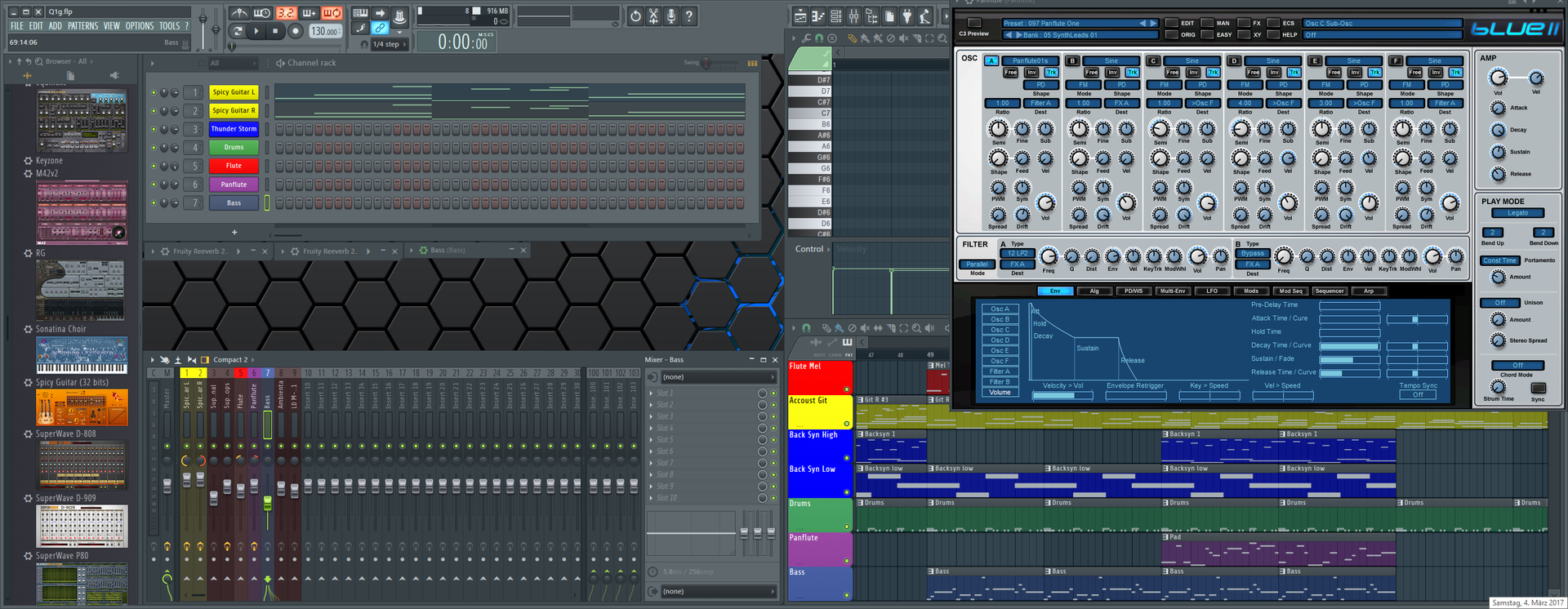 Dieses Jahr habe ich mir eine sogenannte DAW (Digital Audio Workstation) namens FL Studio gekauft und ein paar Software-Synthesizer. Meinen alten Synthesizer (Yamaha DX11) habe ich als Tastatur für die DAW wieder benutzen können.
